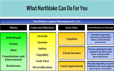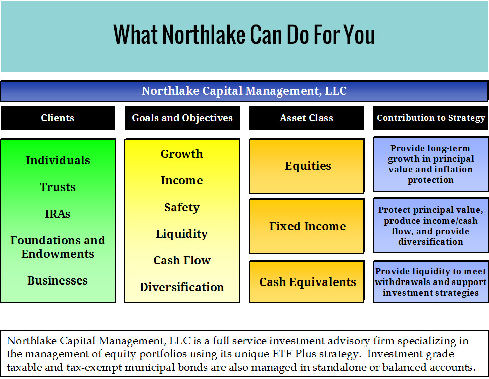 Northlake Capital Management, LLC is a registered investment advisor offering investment advisory services to high net worth individuals and their affiliated entities. Northlake specializes in the management of equity portfolios using exchange traded funds (ETFs) and individual stocks. We build and manage conservative, balanced, or aggressive growth client portfolios depending on individual investment goals and risk tolerance.