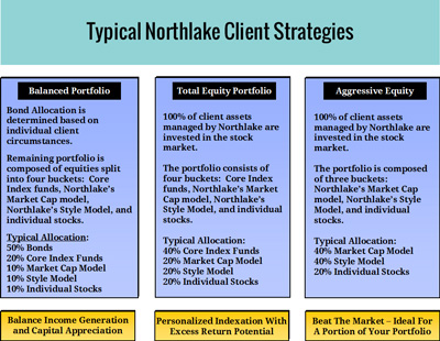 Steve felt so strongly about the need to develop new strategies to confront these challenges that in May 2004 he walked away from a sure thing career-wise and formed Northlake Capital Management. In order to address the new environment, Northlake uses a combination of exchange traded funds (ETFs) and individual stocks. We use ETFs to provide broad equity exposure as core holdings for our clients, while other ETFs and carefully researched individual stocks are held with the purpose of seeking incremental excess return to market indices.