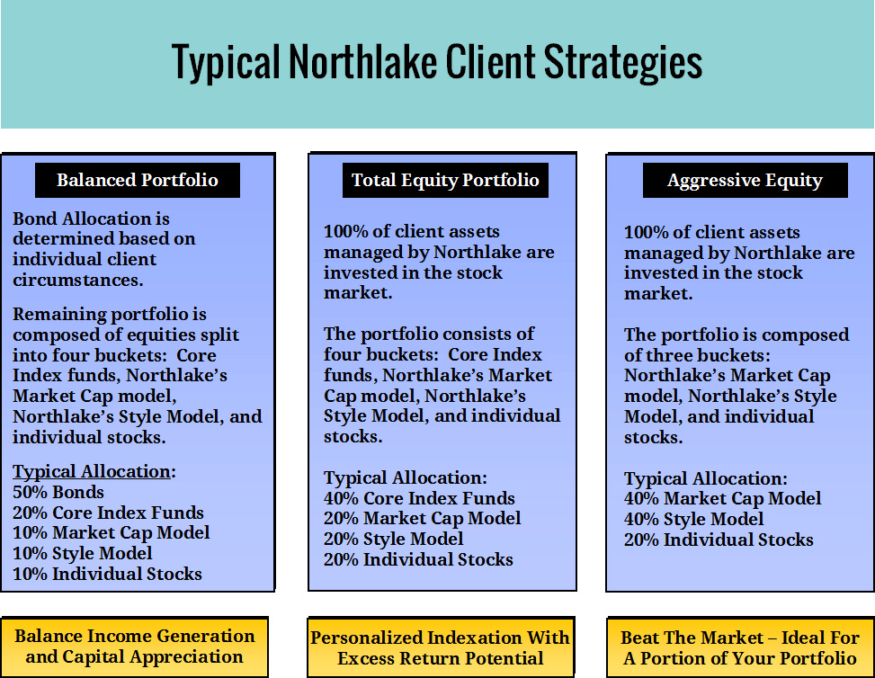 Typically, ETFs driven by the models comprise 60-80% of client equity portfolios. The balance of the equity portfolio is a handful of carefully researched individual stocks from a narrow group of industries. By taking a “narrow but deep” approach to stock selection, Northlake can still maintain an edge relative to the market by focusing on our areas of expertise.